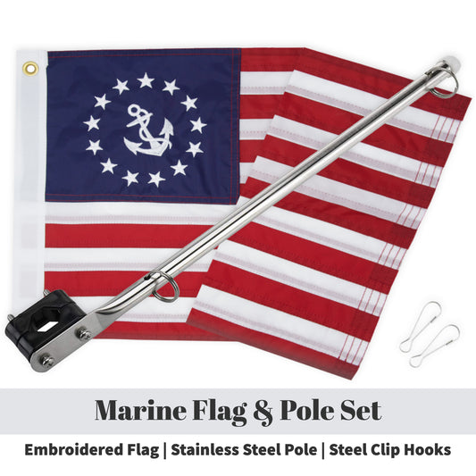 American US Yacht Ensign Boat Flag With Pole Kit 12" x 18" Nautical Cabin Waterproof Embroidered Marine & Golf Cart Flags