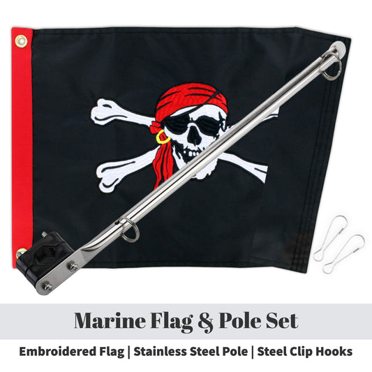 Pirate Skull Boat Flag With Pole Kit 12" x 18" Cabin Waterproof Embroidered Marine & Golf Cart Flags