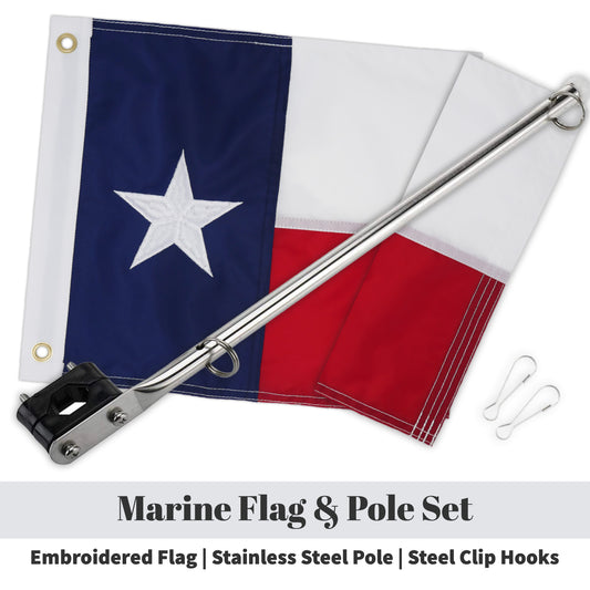 Texas State Boat Flag With Pole Kit 12" x 18" Cabin Waterproof Embroidered Marine & Golf Cart Flags